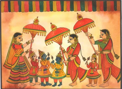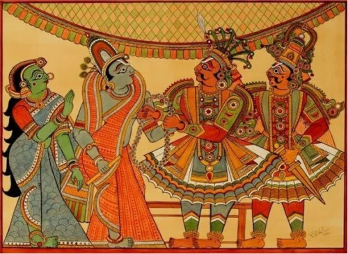 Chitrakathi paintings is the depiction of traditional clothing and accessories which proves to significant motif.. Female figures wear sarees, bangles, and nose rings, while male characters wear dhotis and turbans. the clothing and attire vary according to status and role of character .These intricate details help us understand the culture and lifestyle of the time. The paintings do not follow proportion rules, which reflects unique blend of folk art.