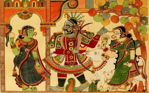 Chitrakathi paintings often incorporate architectural elements such as it is characterized by intricate detailing with depictions of temples, palaces, and village huts. The architectural style in these paintings can vary, showcasing the diversity of structures in the region.