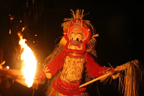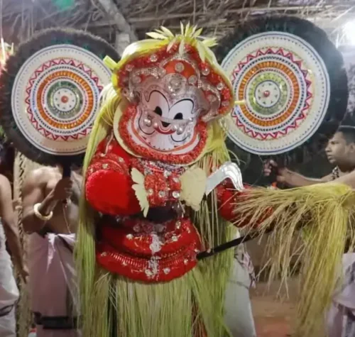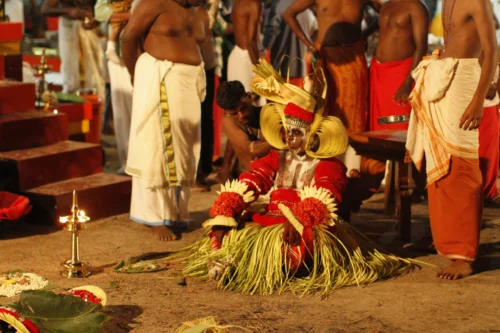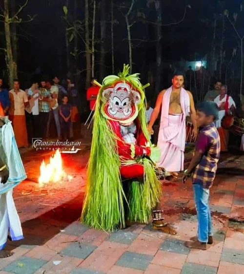 The climax of the performance is the Agnipravesham, or trial by fire. The Theyyam dances, sits, and lies down upon a large heap of burning embers known as a “meleri.” In a breathtaking sequence, temple attendants lead the performer to the smoldering pyre, where he lies down on the coals, then suddenly jumps up, only to repeat the action in all four cardinal directions. This fiery act is also a moment of powerful social satire. While lying on the hot embers, the performer humorously shouts “Enikku Kulirunne“ (“I’m shivering with coldness”), a defiant declaration of transcendence. However, while the performance symbolizes mastery over pain, the instances of performers suffering serious burns are not unknown, highlighting the immense physical danger inherent in the ritual.