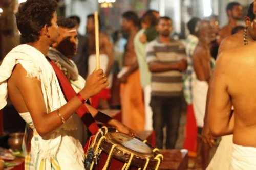However, what ties all these different traditions together is the legend behind the Pottan’s descent. It centers on a confrontation between divine wisdom and human arrogance. The story recounts how the great 8th-century scholar and philosopher Adi Sankaracharya, filled with pride about his wisdom, was traveling through Malanad to attain the epitome of knowledge, the Sarvajna Peetam. On his path, he encountered a Pulaya youth accompanied by his wife and their child (there are regional variations to the details).