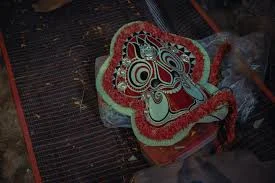 The primary costume consists of a skirt and braided hair crafted from the tender, pale strands of coconut leaves, as they are the materials accessible to all. The tender coconut leaf is also utilized for the headgear, a feature shared by most Fire Theyyams. This simplicity also takes over the accessories of the Pottan. Unlike warrior Theyyams that carry swords, shields, or bows, Pottan Theyyam only implements a small stick and a knife. This signifies his status as a commoner, not a king or warrior, reinforcing the myth’s core message of divinity in the ordinary.