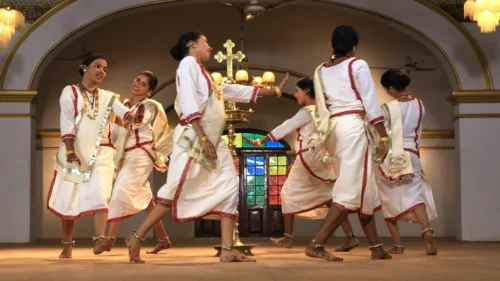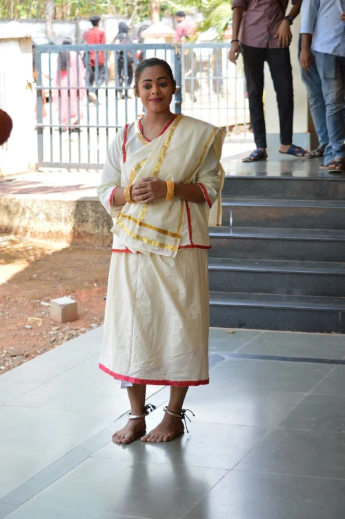 The traditional costume is simple yet deeply symbolic, representing purity and light, and reflecting the historic attire of the community. A simple white Mundu, or a long cloth, is worn around the waist, often with a red or golden border. It is complemented by a white blouse known as a Chatta. Finally, the traditional Christian jewelry, including Mekka Mothiram (large earrings for the upper earlobe), Thoda (round golden ear studs), and heavy silver ankle bracelets called Thala, are used as adornment.