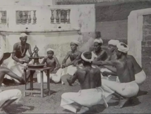The auditory landscape of Margam Kali is also strikingly intimate. The performance relies almost exclusively on the rhythmic, patterned clapping of the dancers’ hands and the vocal lead of the asan (master), who controls the tempo and narrative. While the singer may sometimes use two small, palm-sized cymbals, the absence of other instruments focuses attention on the human elements of voice and rhythm, creating a soundscape of pure devotion that echoes the Syrian liturgical chanting traditions.