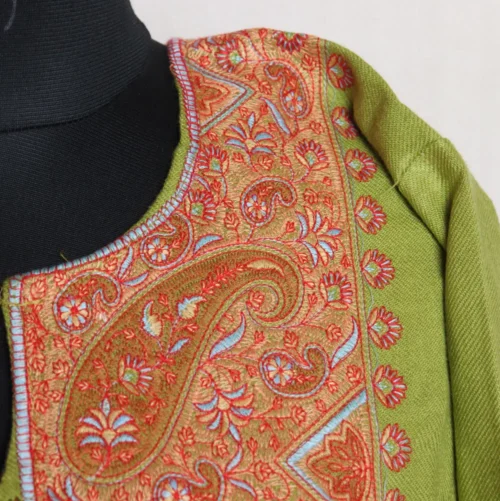 Paisley Motif Pheran (Source: https://www.gyawun.com/product/kashmiri-parrot-green-cashmilon-needlework-pheran-with-sozni-embroidery-dalgate-collection-copy/?srsltid=AfmBOopnj2dHIjfAIfxiOL-u9fL75Qu0sclOz0y85Oeo8A0uHGvIO1gI)