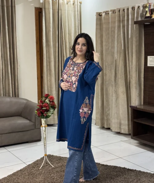 Modern style Pheran (Source: https://www.kashmirorigin.com/products/royal-blue-modern-design-aari-embroidered-pheran-lint-free?srsltid=AfmBOorBW6uoSRy0mp_bA6KZ8YPLErZOuypmScuorop8bFlR_-gTViNQ)