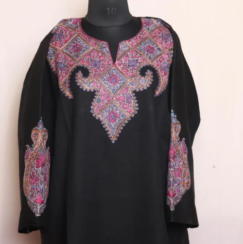Kashmiri Raffal Pheran with Sozni Embroidery (Source: https://www.gyawun.com/product/black-kashmiri-raffal-pheran-with-v-neck-and-hand-sozni-embroidery-mirza-collection/?srsltid=AfmBOopPnlczy8sgBNOv2uUWqounAjdHdykSgI_bvZXHRZq5DnV8DgsK)