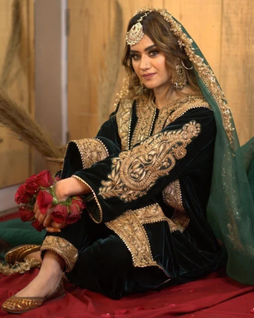 Tilla Embroidery Pheran (Source: https://tulpalav.com/shop/woman/ab-sherun/nikah-bottle-green/?srsltid=AfmBOord0DoKXfgxWBkKbbZIyu4Lc3BPq494mJIyk9FcCcKVEKMZ1Baa)