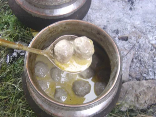 The popular spicy, red-gravy meatball dish, often known as Rista, is one of the major items in Wazwan. Cooking this dish is an extremely labour-intensive process, where wazas need to pound the minced meat on a stone to get a smooth and spongy texture for making the balls.