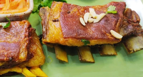In a steady boil, this traditional Kashmiri meal has been prepared twice: once with milk and once with seasonings. Mutton or lamb’s ribs are the main ingredient, where simmering and frying are the two steps of cooking this item as a starter in wazwan.