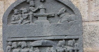 A Viragallu is a vertical stone slab that is divided into three different panels. The stone is a glimpse of a comic afterlife narrating the journey of a hero from earth to heaven.