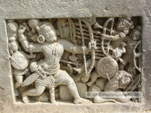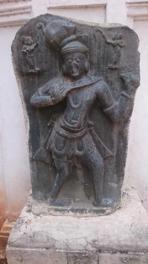 The Garuda pillars portray the scenes of when the king dies, his guards would commit mass suicide. One such example can be seen at the Hoysaleswara temple in Halebidu, where the Garuda pillar honors Kuvara Lakshma, the commander of Veera Ballala II, who committed suicide along with his wife and 1000 soldiers upon his king’s death. These pillars often depict the men severing their own heads.